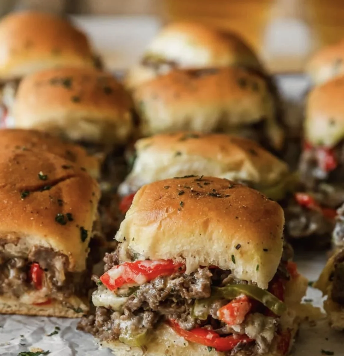 Philly Cheesetake Sliders. Ingredients-Grilled steak, sautéed onions and peppers with white american cheese on toasted Hawaiian rolls w/ mayo. $13