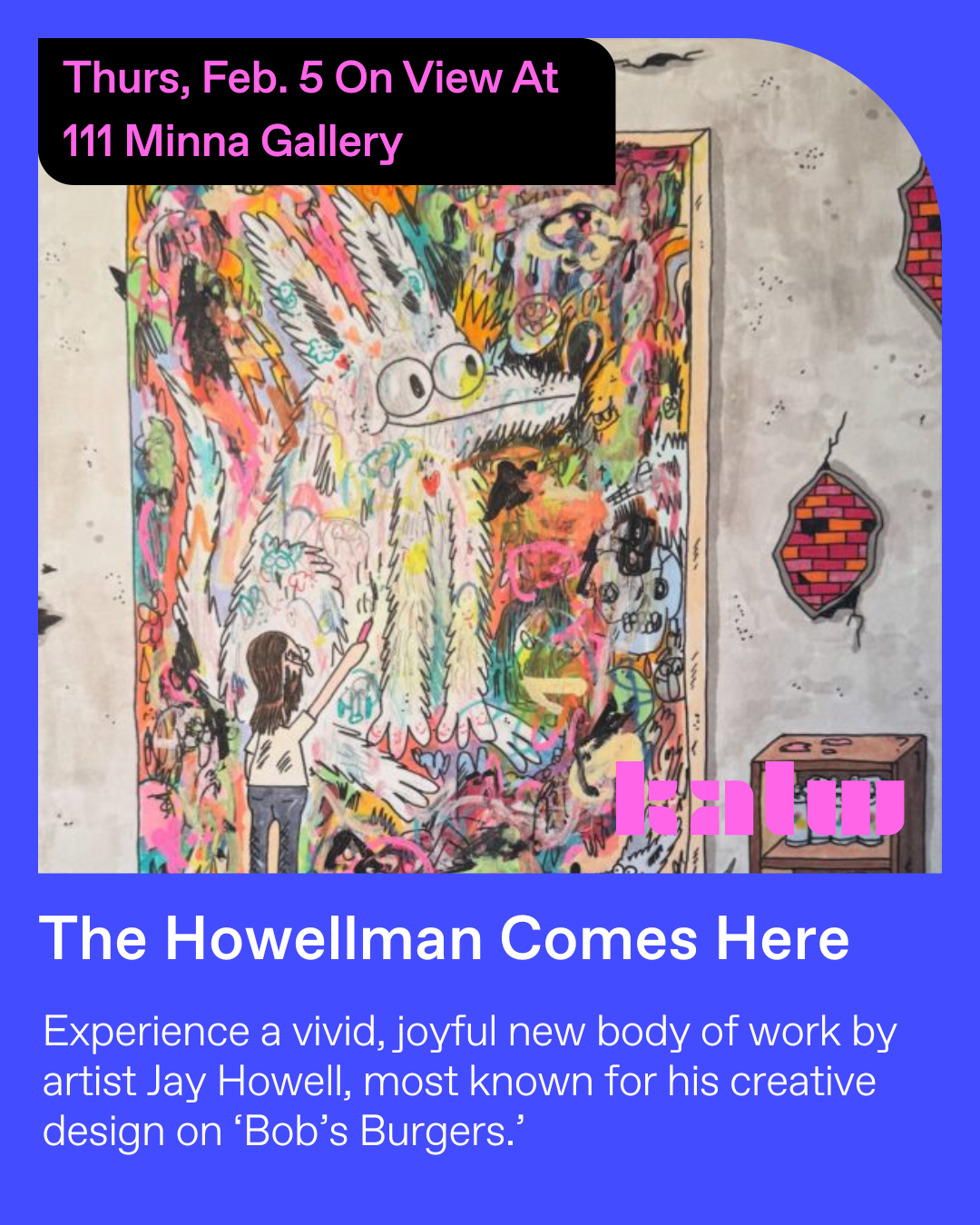 Plus:The Howellman Comes Here. Experience a vivid, joyful new body of work by artist Jay Howell, most known for his creative design on ‘Bob’s Burgers inside 111 Minna Gallery.
