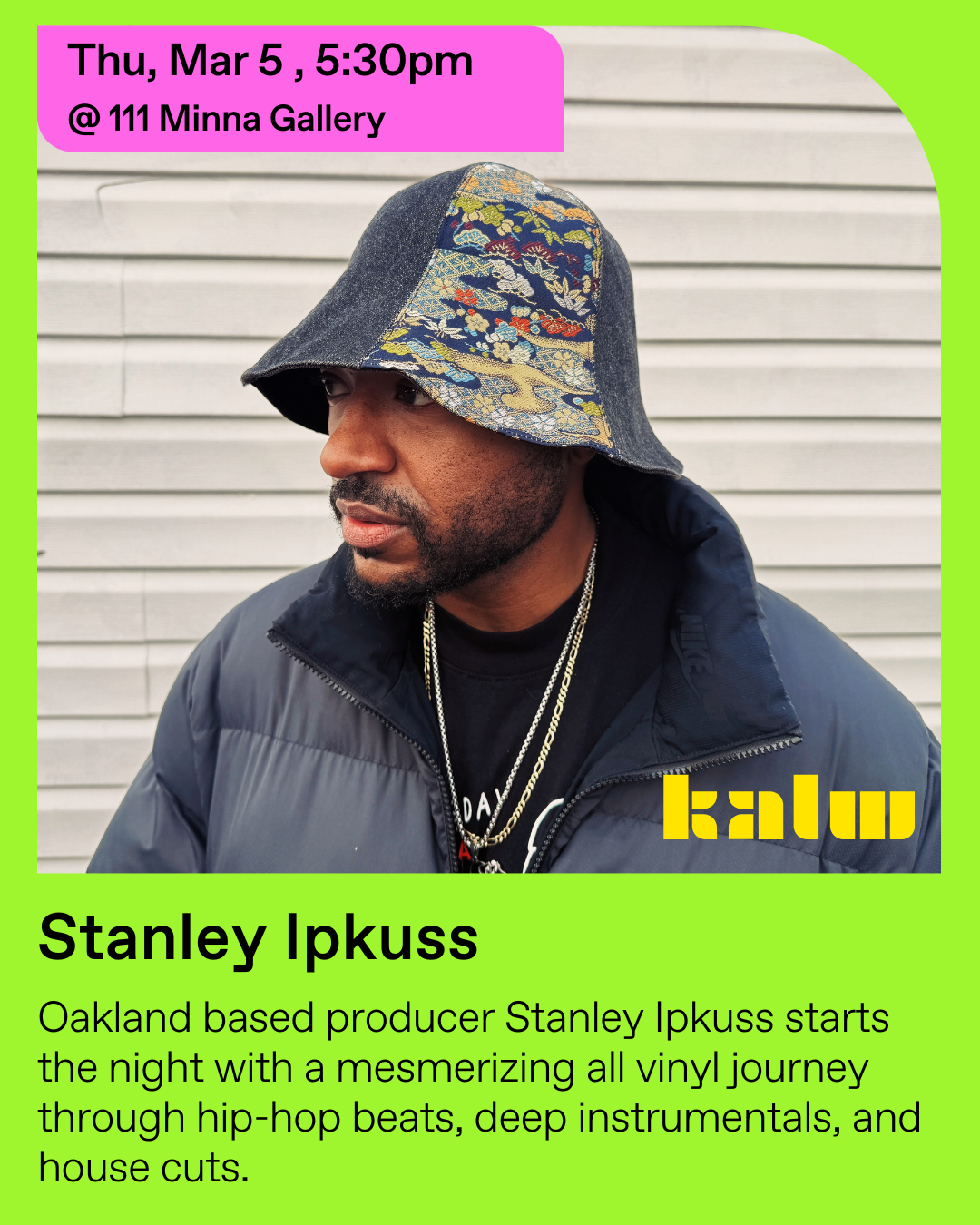 5:30 - 7:30 - Stanley Ipkuss. Oakland based producer Stanley Ipkuss starts the night with a mesmerizing all vinyl journey through hip-hop beats, deep instrumentals, and house cuts.