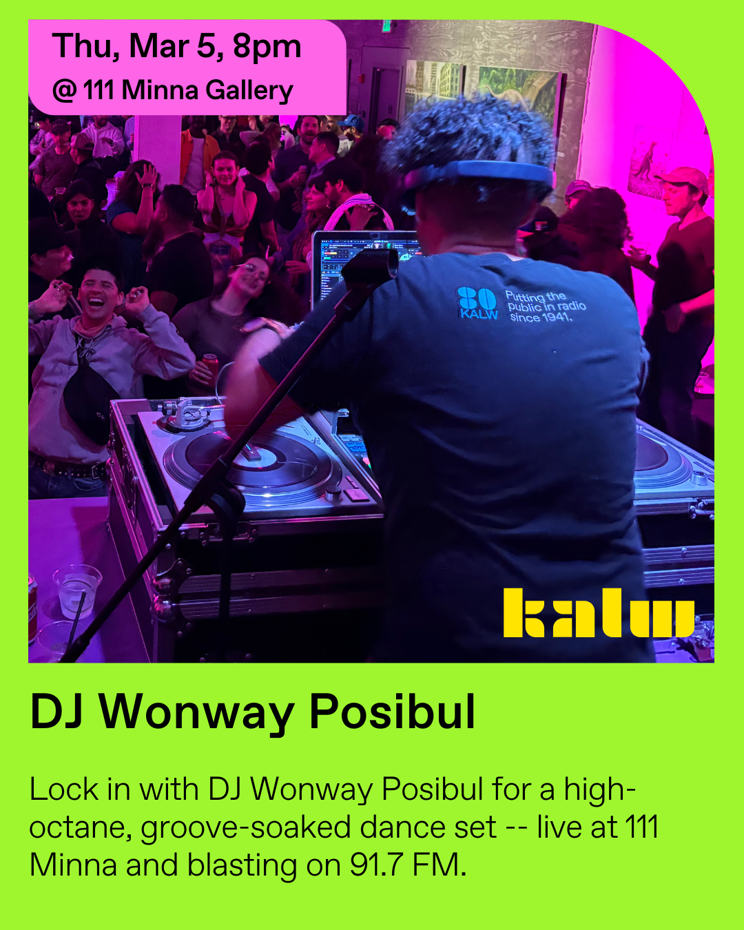 7:30 - 10:30 - Wonway Posibul. Lock in with DJ Wonway Posibul for a high-octane, groove-soaked dance set -- live at 111 Minna and blasting on 91.7 FM.