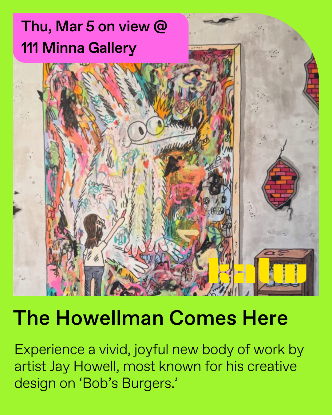 On View - The Howellman Comes Here Experience a vivid, joyful new body of work by artist Jay Howell, most known for his creative design on ‘Bob’s Burgers.’