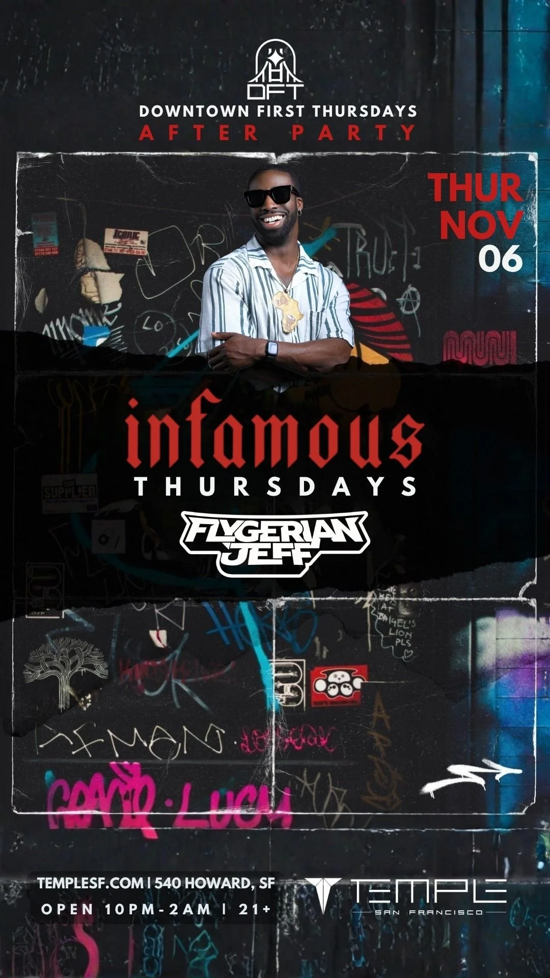 Infamous Thursdays After Party Thursday, November 6, 2025 10:00 PM Friday, November 7, 2025 2:00 AM Temple 540 Howard St, SF, CA 94105 San Francisco, CA, 94105 United States (map) Google Calendar ICS Temple SF Presents: Infamous Thursdays!An intimate weekday party showcasing some of the best turntabilists and open format disc jockeys the Bay Area has to offer. This event will take place in main room at Temple SF with music provided by Flygerian Jeff.Free before 11PM | 21+Tickets